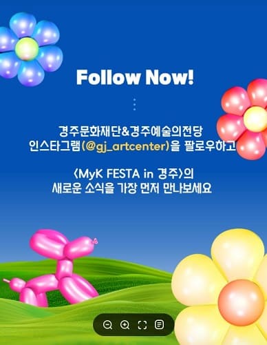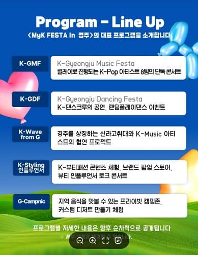 날짜 : 2025.6.7(토)~6.8(일)K-pop concert, Fan meeting, Cover dance, Random play dance, K-beauty&Fashion, K-Influencer, Local food&Dessert장소 : 경주예술의 전당경주문화재단&경주예술의 전당 인스타그램(@gj_artcenter)을 팔로우하고 <MyK FESTA in 경주>의 소식을 빠르게 만나보면 좋겠네요~ 인스타그램에서 자세한 내용들이 순차적으로 공개된다고 해요!